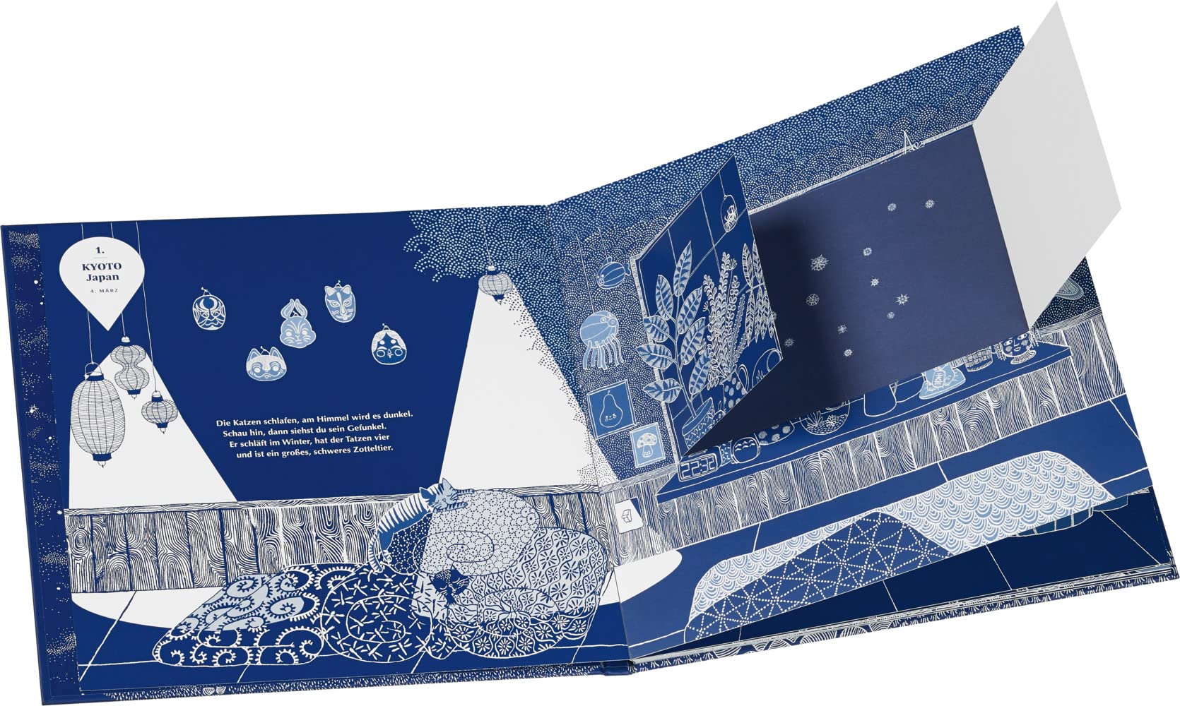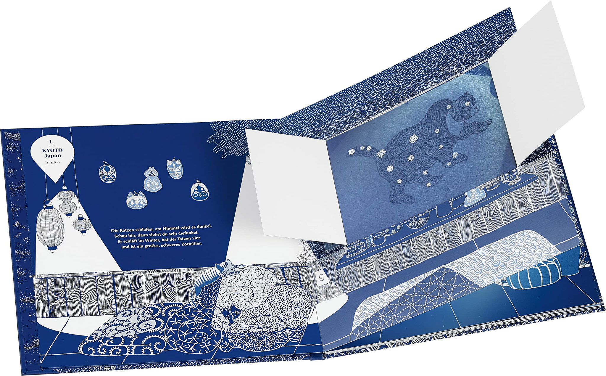 Ein magisches Buch mit detailreichen Illustratorinnen in Blau und Weiß mit fast schon wimmeligen Charakter und kurzen Rätselreimen die Hinweise auf die Himmelstiere geben, die man nach dem Öffnen des Fensters, wenn man die Seite gegen eine Lichtquelle hält, entdecken kann. Eine kurze Erklärung und Zuordnung der Sternbilder und eine weltweite Sternkarte runden dieses außergewöhnliche und wunderschöne Buch ab.